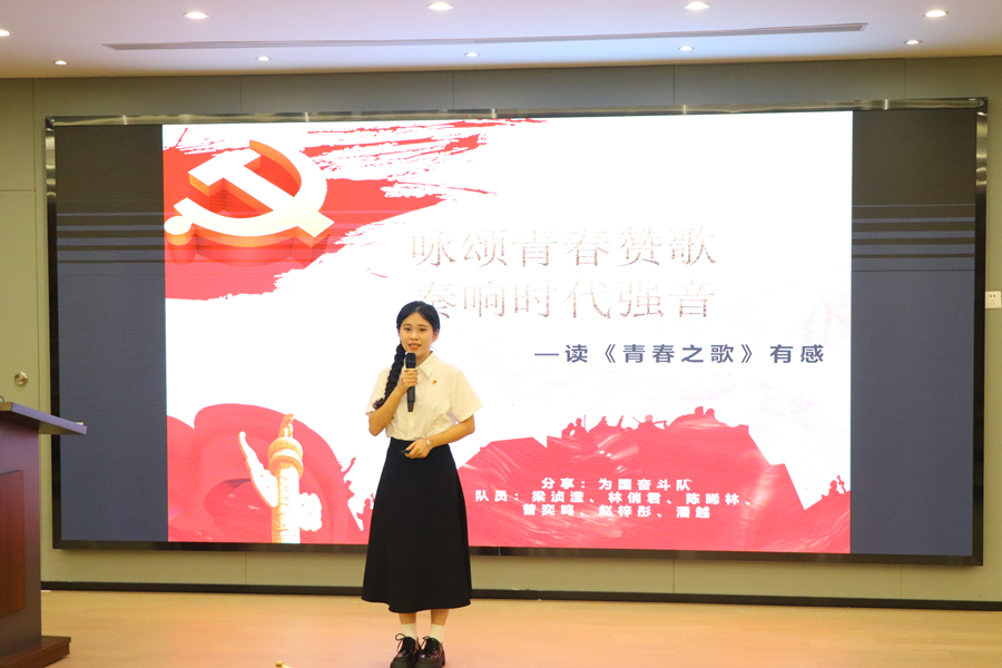 学生第一党支部林俏君代表“为国奋斗队”通过探作品之核、揭人物之奥、彰经典之韵、悟青春之歌四个方面做红色经典书籍《青春之歌》的读书分享,带领学员们于青春之歌中悟青春之道。“打倒反动的国民党!”“中国共产党万岁!”“共产主义是不可战胜的!”这高亢激昂的呼声振聋发聩,展现着青春气象,传达着热血精神,呼吁在场学员唱响青春乐章,共谱时代强音。