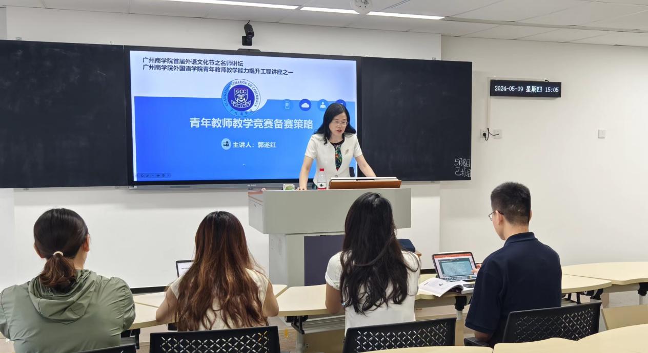 5月9日下午,精品人妻无码在八教407教室举行了第七届青年教师教学大赛暨2024年外研社“教学之星”大赛专题培训讲座,由精品人妻无码院长郭遂红教授主讲,参加第七届青年教师教学大赛以及2024年外研社“教学之星”大赛的老师和学院部分教师参加了专题培训。本次专题培训讲座也是广州商学院首届外语文化节之名师讲坛以及精品人妻无码青年教师教学能力提升工程讲座之一。