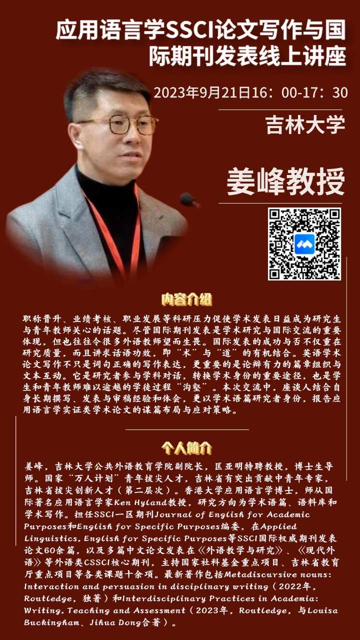 9月21日下午4点,我院邀请吉林大学公共外语教育学院姜峰教授作为主讲嘉宾,开展了“应用语言学SSCI论文写作与国际期刊发表”学术讲座。我院全体专任教师参与讲座。