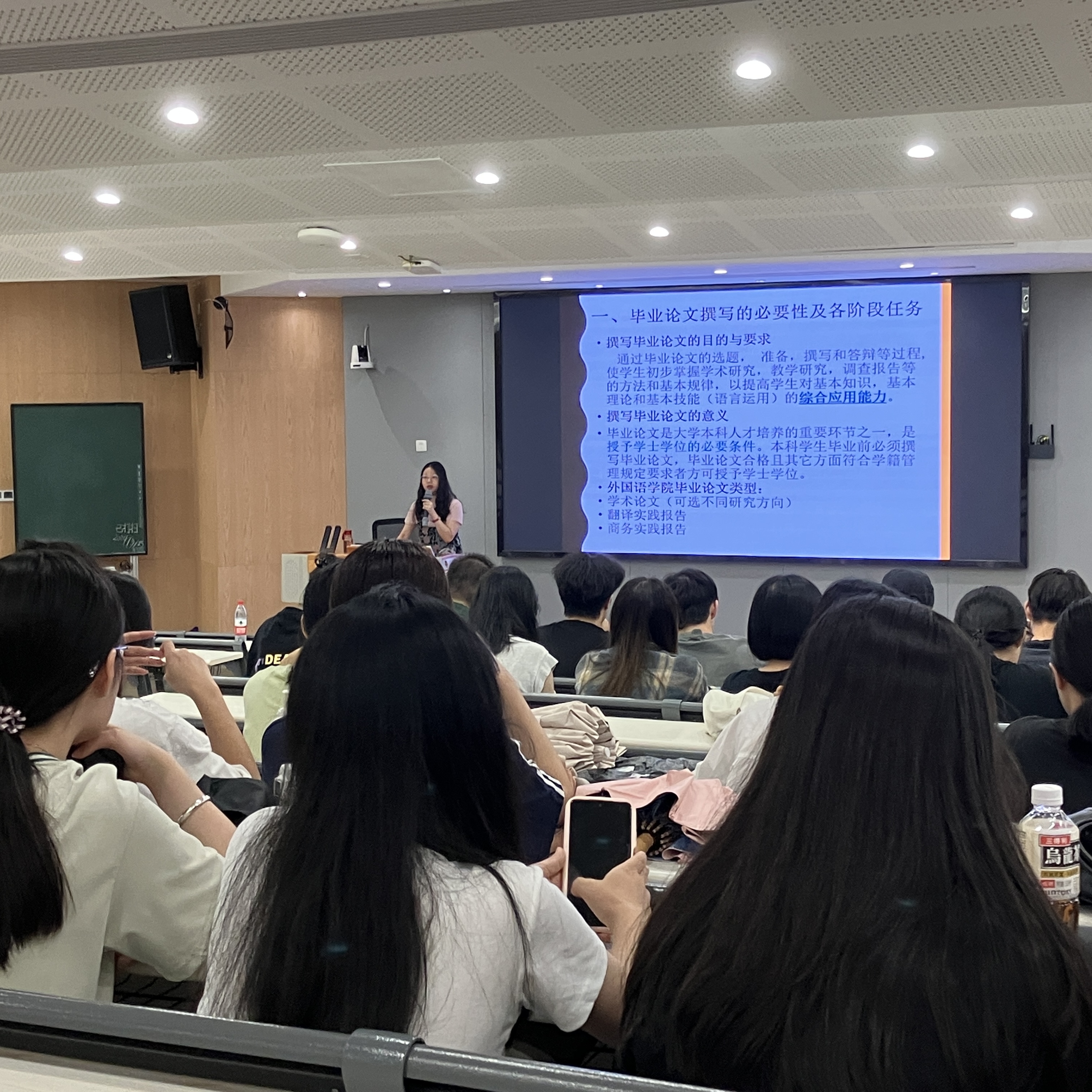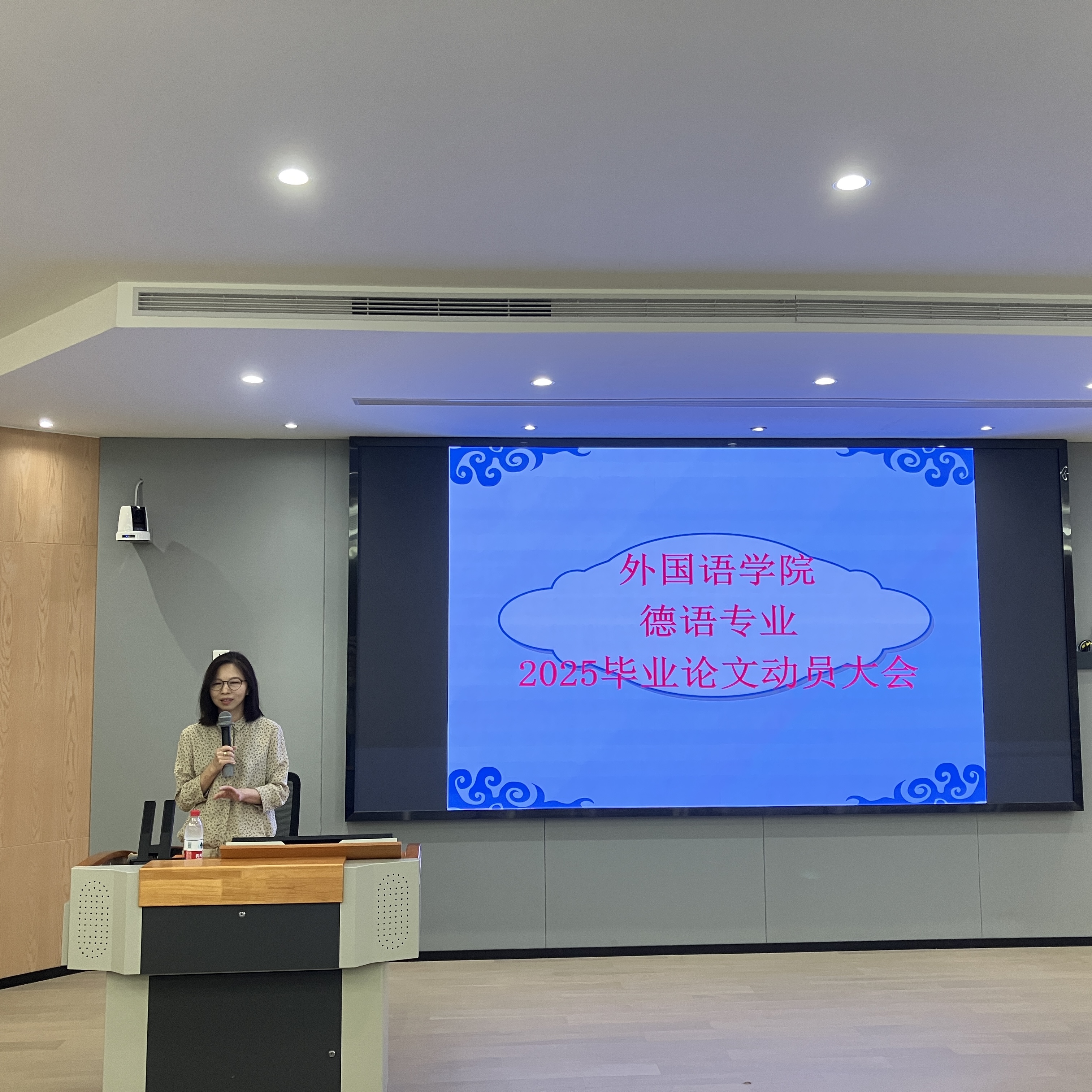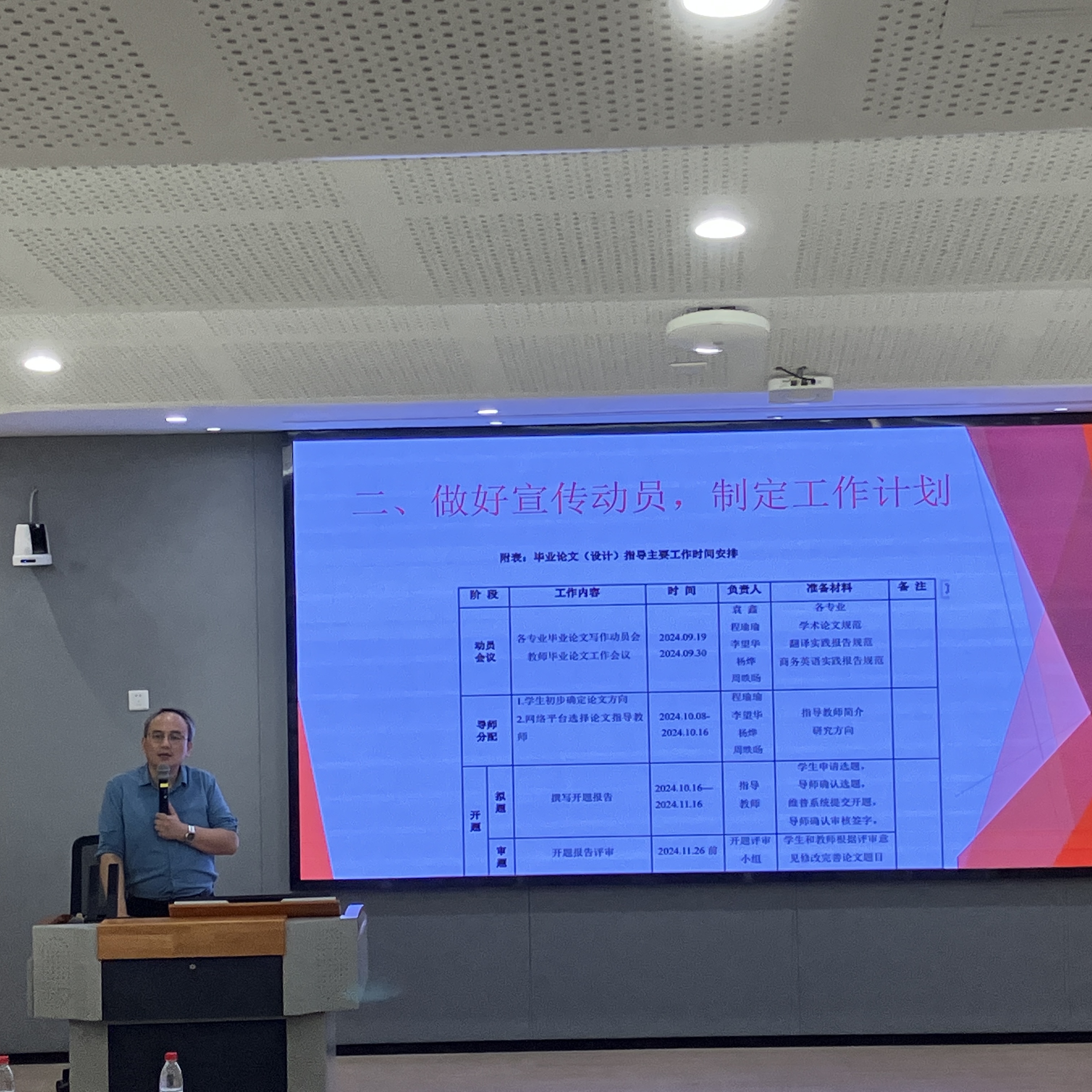 9月26日,为了更全面地覆盖即将步入毕业论文撰写与毕业实习阶段的毕业生,特别是考虑到部分同学已在校外进行实习,我院在教学楼八教103创新性地采取了现场与线上直播相结合的方式,成功举办了2025届毕业论文毕业实习动员大会。此次会议不仅确保了留校学生能够直接参与、实时互动,也让校外实习的同学们能够跨越地域限制,同步获取重要信息与指导。会议由精品人妻无码副院长袁鑫、商务英语系主任李望华、英语专业系主任程瑜瑜、德语专业系主任周昳旸以及教务员杨超参加会议,各会议专场由各系主任主持。