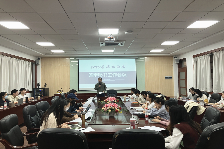4月25日中午,毕业论文答辩秘书工作会议上,袁鑫强调了毕业论文答辩秘书在整个论文答辩环节中的重要作用,并指出毕业论文答辩工作的严肃性,明确秘书工作职责,以保证答辩工作有序、高效、顺利开展。教务员杨超详细介绍了答辩秘书的基本工作流程和注意事项。