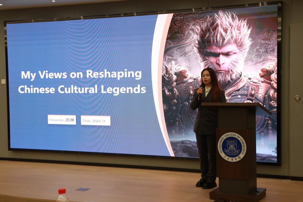 随着徐超书记的精彩致辞结束,本次演讲决赛正式拉开帷幕。大赛历经班级作文初赛、演讲复赛的层层筛选,最终汇聚了37名佼佼者于院级演讲决赛的舞台。决赛环节要求参赛者围绕“A Proposal for Reshaping Chinese Cultural Legends”的主题,展开不超过5分钟的英文演讲。在决赛现场,参赛者们基于《黑神话:悟空》等中国文化产品在国际市场上的成功,从科技与人文的交融、大国工匠精神的传承等多个维度,深入探讨了如何让中国文化走出去,取得更大的成功。他们的演讲内容充满创新,观点独到,充分体现了广商学子扎实的语言能力和辩证思维。在演讲中,选手们以扎实的专业知识、准确的切入点、流利的口语表达、精美的PPT动画,赢得了评委和观众的热烈掌声。