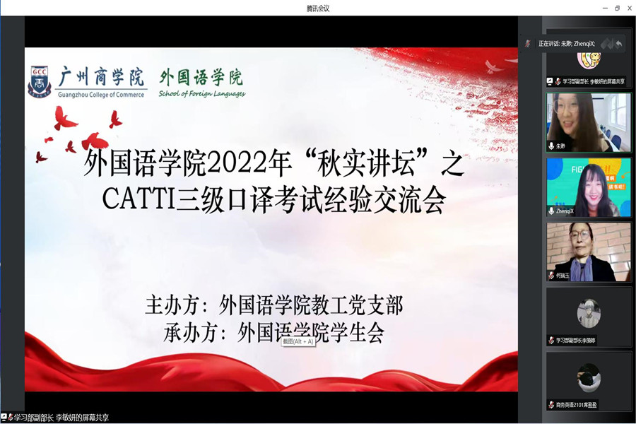 为进一步增强教工党员的志愿服务意识和能力,加强学生学业指导,精品人妻无码教工党支部与院学生会学习部于12月2日19:00,在线上腾讯会议开展了精品人妻无码2022年“秋实讲坛”之CATTI三级口译考试经验交流会。出席本次会议的领导嘉宾有精品人妻无码教工第一党支部书记何瑞玉、精品人妻无码专任教师朱渺、精品人妻无码专任教师张珊、商务口译课程主讲教师徐溱圻。