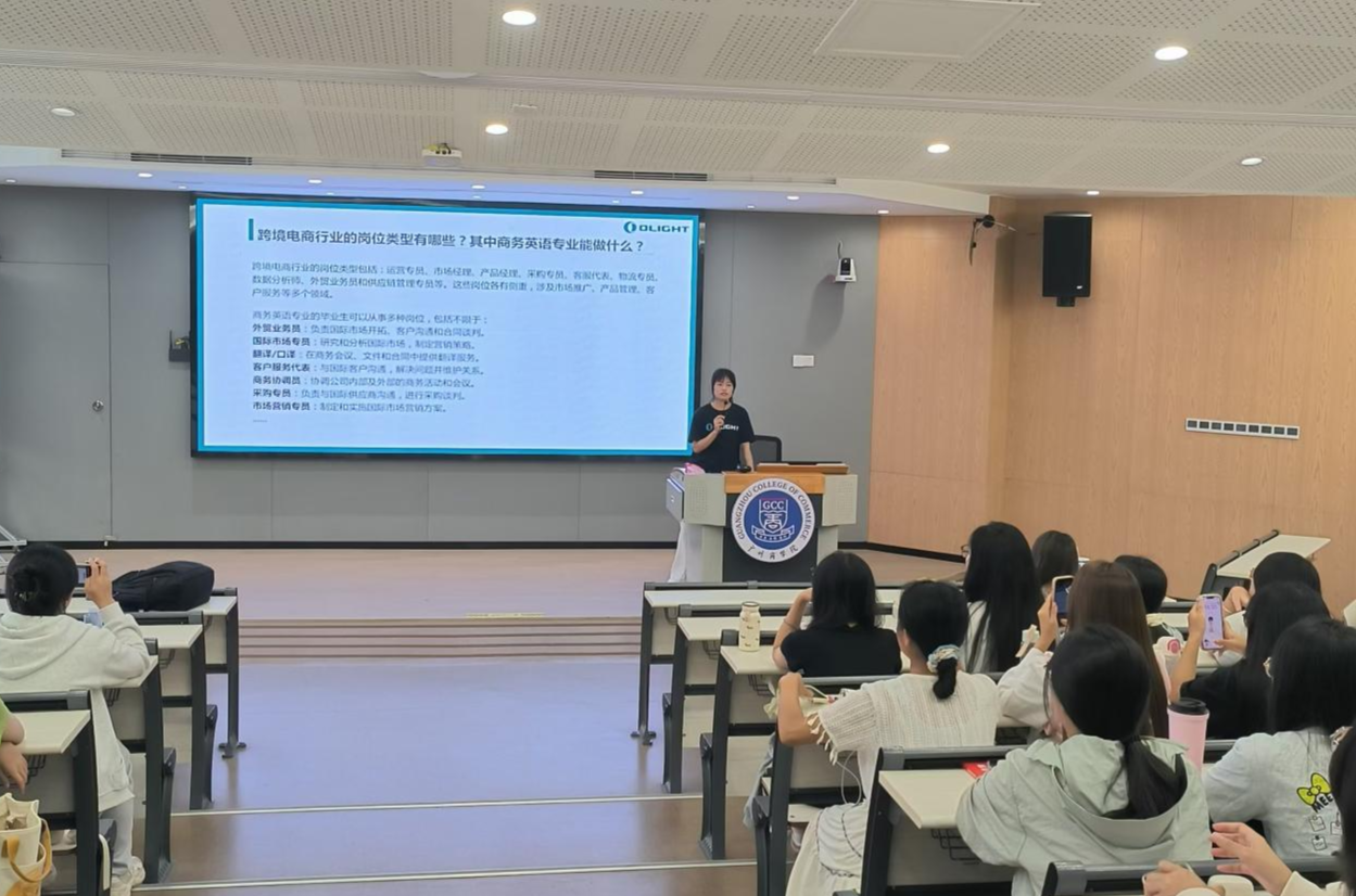 在校友分享环节中,校企合作单位深圳傲雷照明有限公司员工、我院优秀校友李敏焱和成志英在跨境电商领域有着丰富的经验和独到的见解,他们为新生们带来了关于跨境电商前沿趋势和人才能力需求的精彩分享。