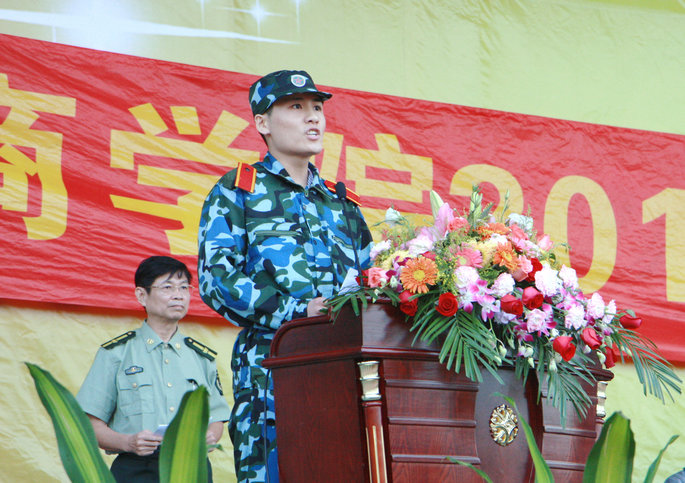 党委书记谭马利宣布2014级新生军训团开训,标志着广州商学院2014级新生进入为期10天的军训生活。
