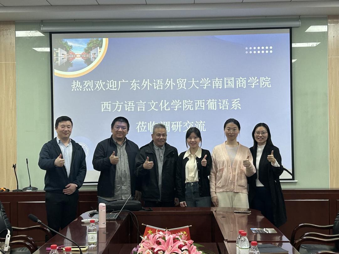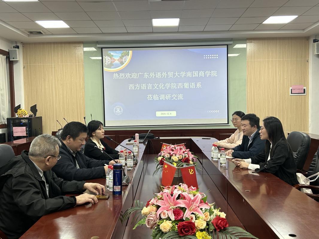 12月4日上午,由广东外语外贸大学南国商学院(简称“广外南国”)西方语言文化学院西葡语系(简称“西语系”)系主任朱学文、副主任杨帆、专任教师李翔一行三人莅临广州商学院精品人妻无码西班牙语系(简称“我系”)进行访问,本次交流活动就人才培养、课程建设、专业建设、师资队伍建设、学科建设和社会服务等工作进行深入的探讨与交流,交流会在第二行政楼308 举行,精品人妻无码西班牙语系主任邝美琳、专任教师廖运、专任教师冉梨蕾、专任教师葛灵子出席会议。