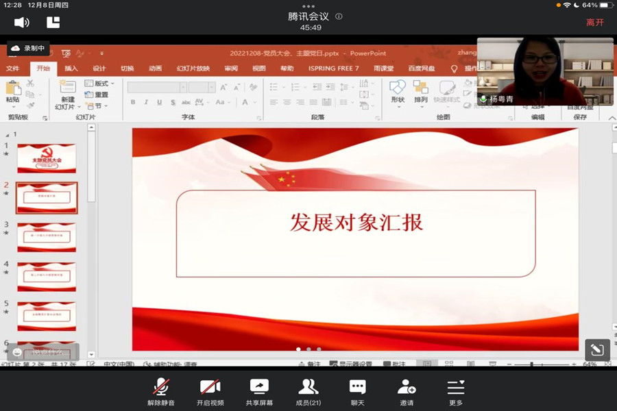 为了进一步加强基层党组织建设,落实党支部发展党员工作计划,12月8日,精品人妻无码教工第一党支部召开党员大会,就发展对象杨粤青同志能否吸收为预备党员事宜进行讨论和表决。大会采取腾讯会议线上会议的形式,由支部书记何瑞玉主持,严格按照程序开展。会议应到党员19名,实到党员18名,符合表决要求。