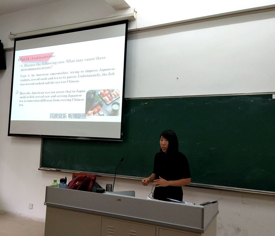 本次研讨课主讲老师为张哲老师,主要内容为第2单元Text II The Business Context in Inter-cultural Communication。在进入课程主题前,由一名学生用约10分钟的时间对课前收集的关于不同文化沟通交流的资料进行讲解,然后通过问题互动的方式引出本次课程主题。张老师把课文理解分解为三个任务,引导学生以小组讨论的方式对课文进行层层深入的剖析,遇到重点难点教师再进行深入的讲解,帮助学生建构知识网络。课件制作用心,条理清晰,师生互动较多,教学效果良好。