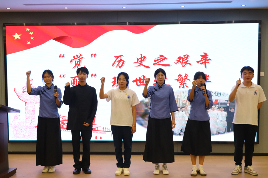 学生第一党支部张嘉豪代表“一心向党队”做题为《觉醒年代燃烽火,使命担当铸辉煌》的汇报,通过对影视作品《觉醒年代》中毛泽东、蔡元培、陈独秀和李大钊的经典人物解析和重要事件概括,生动再现了一百年前中国的先进分子和热血青年为追求真理的澎湃岁月。慷慨激昂的诗朗诵《不朽》,在后人与先辈们之间的对话中,激励在场学员要将个人命运同民族命运结合起来,以坚定的意志奋勇前行,创造不负革命先辈期望、无愧于历史和人民的新业绩。