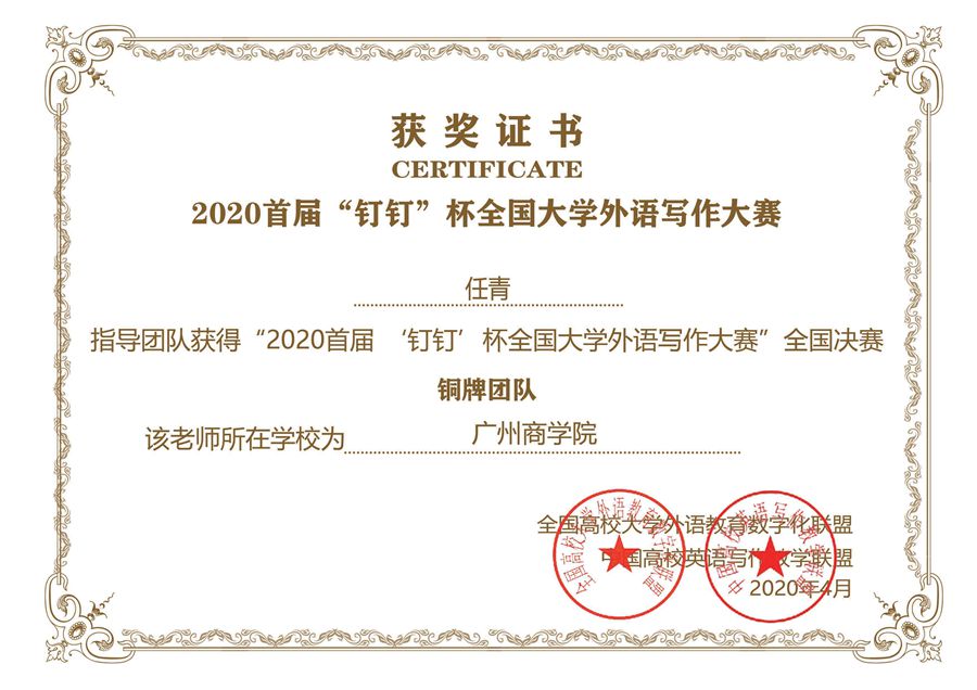 2020 年首届“钉钉”杯全国大学外语写作大赛是由全国高校大学外语教育数字化联盟、中国高校英语写作教学联盟联合主办的,覆盖全国在校大学生的线上外语写作比赛活动,是我国高校英语教学的一项重要的评价手段和激励机制。我校在本次大赛中获得佳绩,有力证明了近年来我校在深化外语教育教学改革,提高应用型人才培养质量的显著成效。