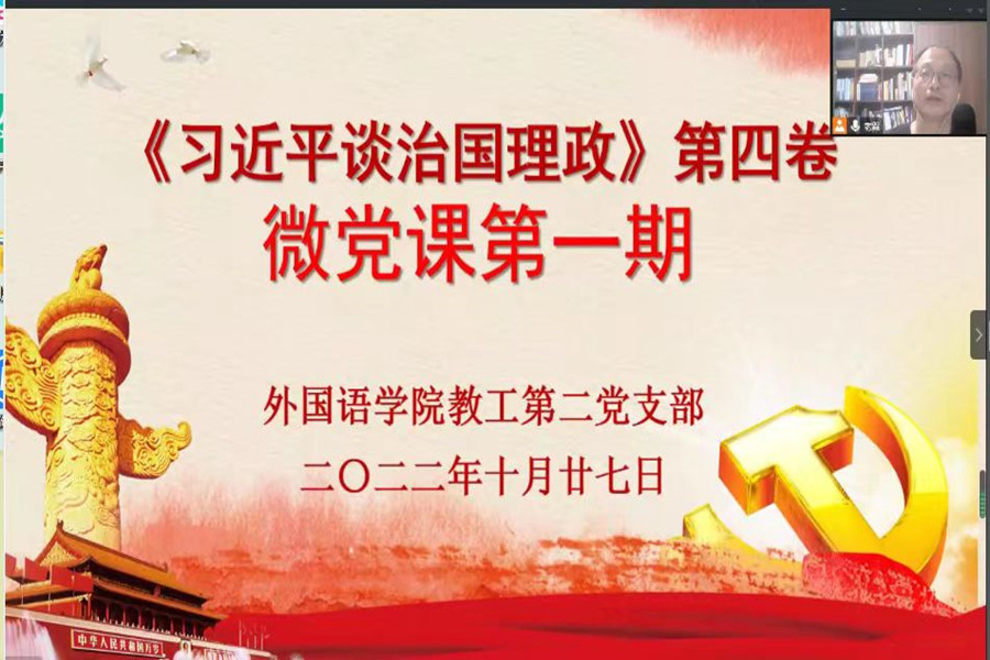 10月27日晚,为深入学习宣传贯彻《习近平谈治国理政》第四卷,精品人妻无码教工第二党支部线上微党课活动正式开课。活动本着“支委带头,全员参与”的原则,旨在通过让每一位党员讲党课,引导全体党员准确把握《习近平谈治国理政》第四卷的核心要义、精神实质、丰富内涵和实践要求。本次微党课活动共四期,每一期由四至五名党员宣讲,每名党员宣讲一至两个专题。第一期由本届和上届支委会成员唐海民、范俊英、姚丽芳、潘文晗等老师主讲。