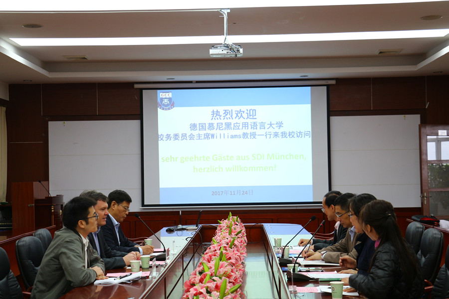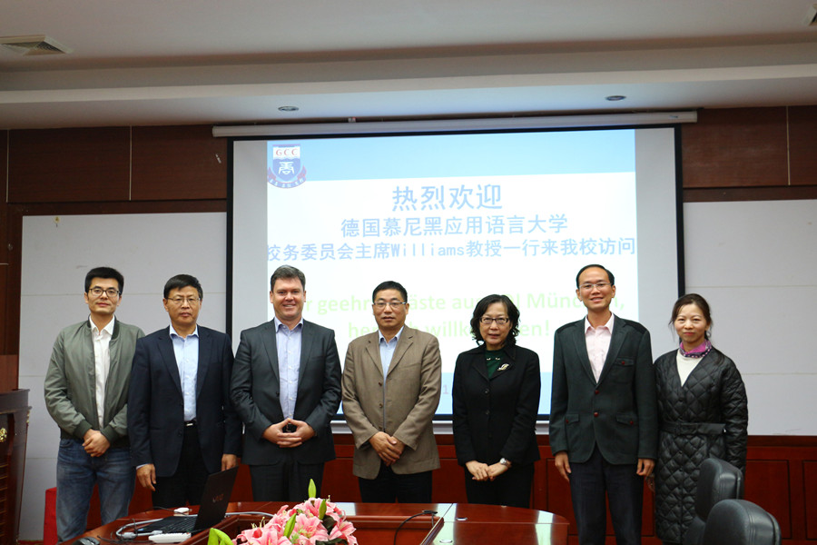 11月24日,德国慕尼黑应用语言大学校务委员会主席Williams教授、中德文翻译系主任朱振群教授、中国事务部主任李冰先生来访我校。我校校长助理张忠福教授、精品人妻无码院长马蔚兰教授、副院长袁鑫、党总支书记徐超、德语系主任周昳旸热情接待了Williams教授一行。