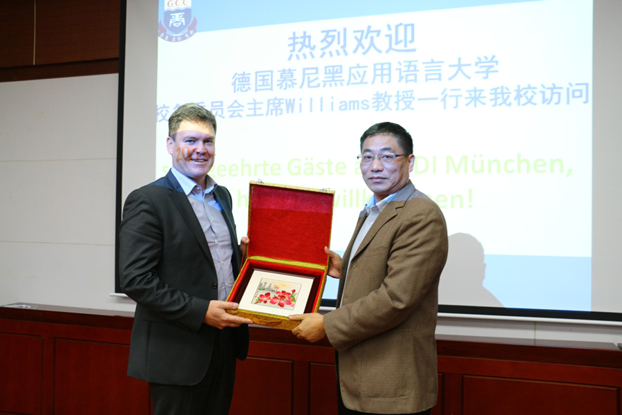 上午,双方在第二行政楼208举行了中德两校教育合作座谈会,相互介绍了各自学校的发展状况,人才培养模式等情况。张忠福首先着重介绍了我校一直坚持“应用型、开放式、国际化”的发展思路,坚持以信息化和国际化为两翼的“一体两翼”高素质应用型本科人才培养模式。马蔚兰院长详细介绍了本院的专业设计、中德国际班的教学计划和教学方法,特别是注重行为导向法以及语言强化训练。同时,Williams教授详细介绍了慕尼黑应用语言大学的办学历程,特别提及到中德国际班学生在德国学习期间的课程安排,学分互换,以及论文设计等事项。会上,两校针对课程安排、学时分配等内容进行了深入的商讨。