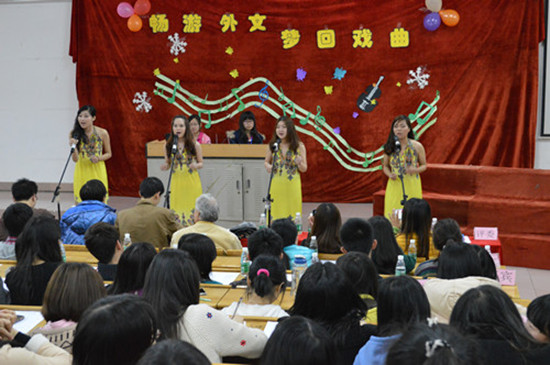 活动中, 8支参赛队伍在灯光闪耀的舞台中激情地演绎着各具特色的外文歌曲。欢快的旋律、动感的歌词、精彩的表演呈现了一场视听觉盛宴。其中身穿孔雀图沙滩长裙的Black Tea队伍深情地演唱了《Schuld war nur der Bossar Nova》,令人难以忘怀。Dream Team队伍全情投入地演唱了《I believe I can fly》,充满活力与激情的表演更是赢得了全场热烈的掌声。紧接着,外语系团委自导自演的“孔雀东南飞”话剧也博得了观众的阵阵喝彩。接下来,戏曲表演加分环节,各参赛队伍淋漓尽致的发挥,充分展现了他们的机智聪慧和丰富的传统文化知识。经过一场角逐,最终,Bleak Tea 队伍荣获一等奖,Dream Team队伍荣获二等奖,Freudbringen荣获三等奖。