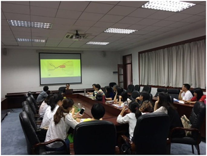 会议围绕如何开展基础阶段与高年级阶段英语教学衔接工作而展开。首先由皇婉贞,李海燕,李亮晶及谭静老师作为基础阶段教学代表分别对英语专业基础阶段课程教学方法做出了汇报总结。各位老师从学生存在的问题出发,逐一给出了目前各个课程所采用的解决方案,同时也提出了基础阶段教学过程中老师们的困惑。随后张蕾老师代表高年级英语教学组提出了高年级学生英语学习过程中出现的问题,并与基础阶段教师就如何有效衔接两个阶段教学做出了讨论,指出基础课程组可以在教材文本复杂度、词汇量标准、文化知识学习与阅读量等级设定方面与高年级课程对接。会议最后,王友贵教授给在座老师提出了几点建设性意见。王教授认为,要建设具有广商特色的英语专业,首先要从人才培养目标着眼,明确广商需要培养的是能够与他人沟通的双语人才;其次,要将各个年级的教学目标量化,规定学生结束一阶段学习后能够达到何种水平;最后,王教授以疑难词汇教学为例,提出了科研新思路,供老师们参考。