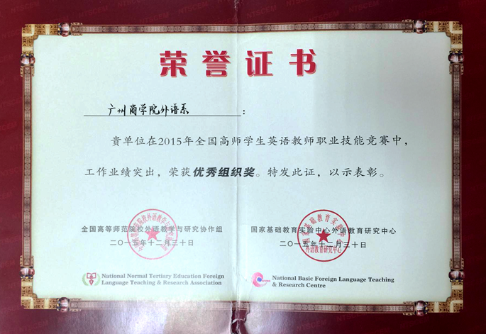 2015年11月,全国高师学生英语教师职业技能竞赛(以下简称全国高师竞赛)初赛在我校顺利举行,共有150名学生参加,经过激烈的笔试,一级和二级分别有4人和9人进入决赛;决赛邀请了我系外语专业教授担任评委,比赛选手以说课的形式进行角逐,经过三个钟头的比拼,来自14级的黄美婷获得一级一等奖,来自12级的袁蔚亭与13级的吴茂莹并列获得一等奖。同时外语系也以有序的组织,良好的考风及专业的评审获得了主办单位的好评,被评为“优秀组织奖”。