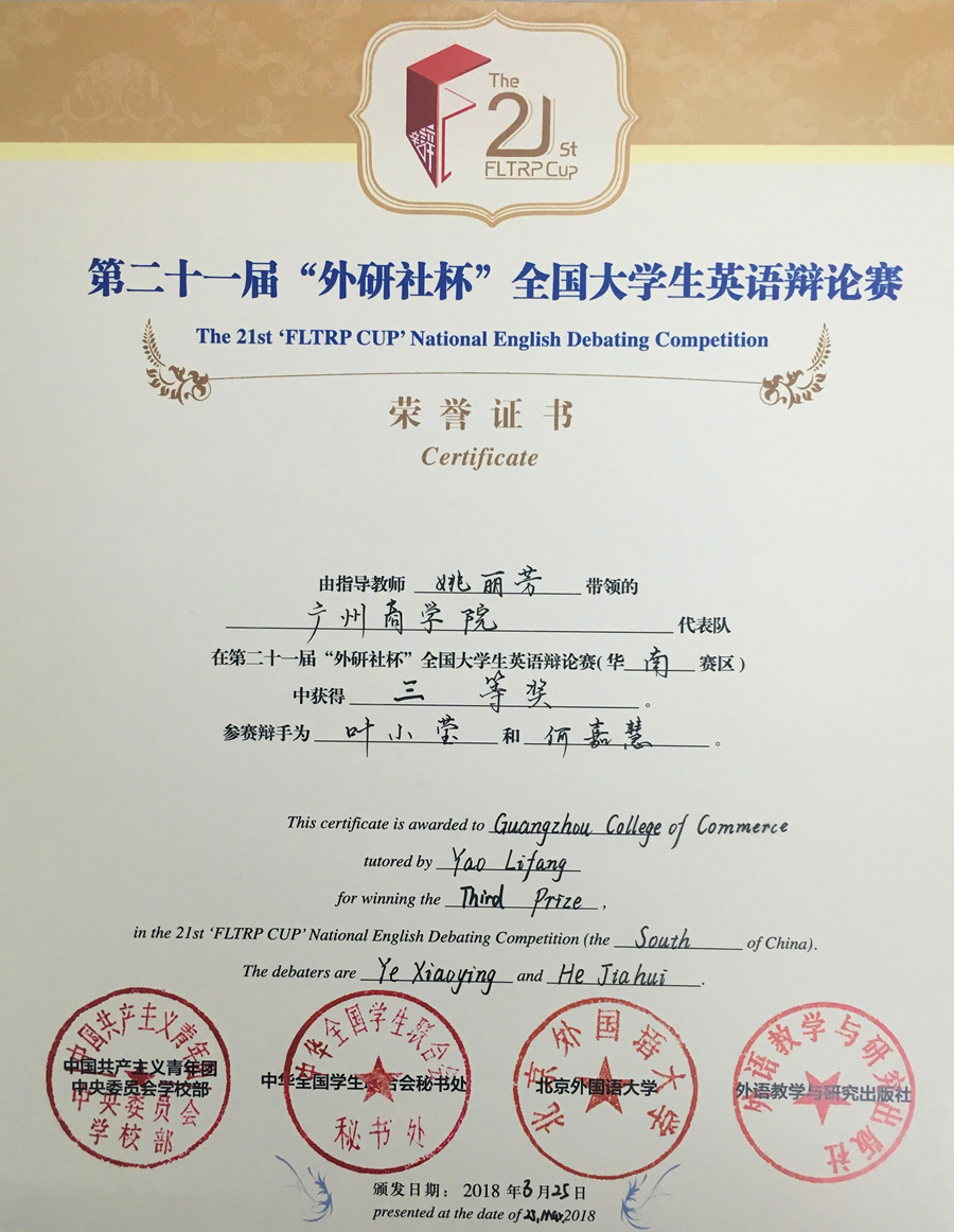 第二十一届“外研社杯”全国大学生英语辩论赛华南总决赛于3月23日至3月25日在华南农业大学落幕,来自广东、福建、湖北、湖南等98支辩论队伍参加比赛。通过校级选拔赛的层层筛选,由2015级商务英语专业何嘉慧、叶小莹同学组队代表我校参加比赛,并荣获三等奖。