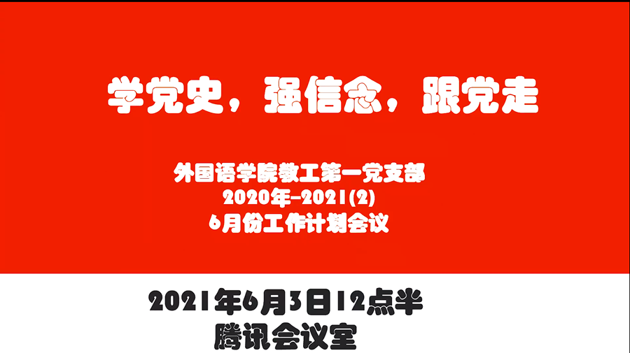 6月3日中午,我院教工第一党支部在腾讯会议召开了“学党史,强信念,跟党走”党史学习教育专题工作计划会议,本次会议由党支部书记李海燕主持,党支部全体教工党员出席会议。