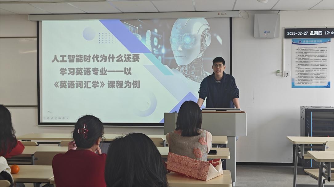 随后,会议进入了专题研讨环节。首先,赖泽科老师做了题为“人工智能时代为什么还要学习英语专业——以《英语词汇学》课程为例”的报告,他深入剖析了人工智能时代学习英语专业的必要性。赖泽科指出,面对国内外高校英语专业的调整或撤销,以及英语文本编辑与翻译就业市场的萎缩,外语专业正面临前所未有的挑战。然而,他同时也看到了跨学科融合带来的新机遇,倡导构建“英语+X”的培养体系,通过引入语义场理论构建术语库、利用词语语义关系优化大语言模型、追溯词源增强文化适配等措施,实现《英语词汇学》课程的转型与升级。