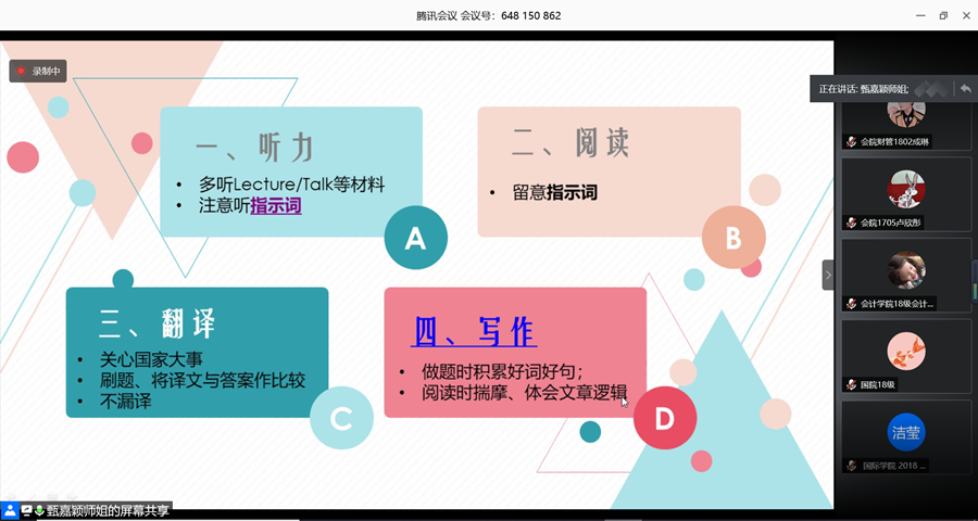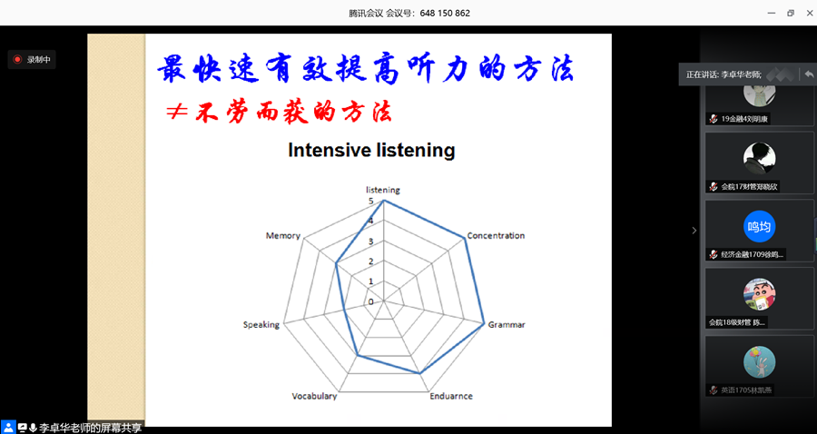 为进一步推进基层党建工作水平提升, 实现基层党组织的党建工作与学校人才培养有机结合,2020年7月14日晚上,精品人妻无码教工第二教工党支部与校学生会通过“腾讯会议”平台联合举办了“春华讲坛”之大学英语六级考试师生经验交流会。精品人妻无码第二党支部教工党员李卓华老师担任主讲教师,精品人妻无码的甄嘉颖同学担任学生嘉宾。学生们通过“腾讯会议”平台参加讲座,打破了受疫情影响造成的空间限制。