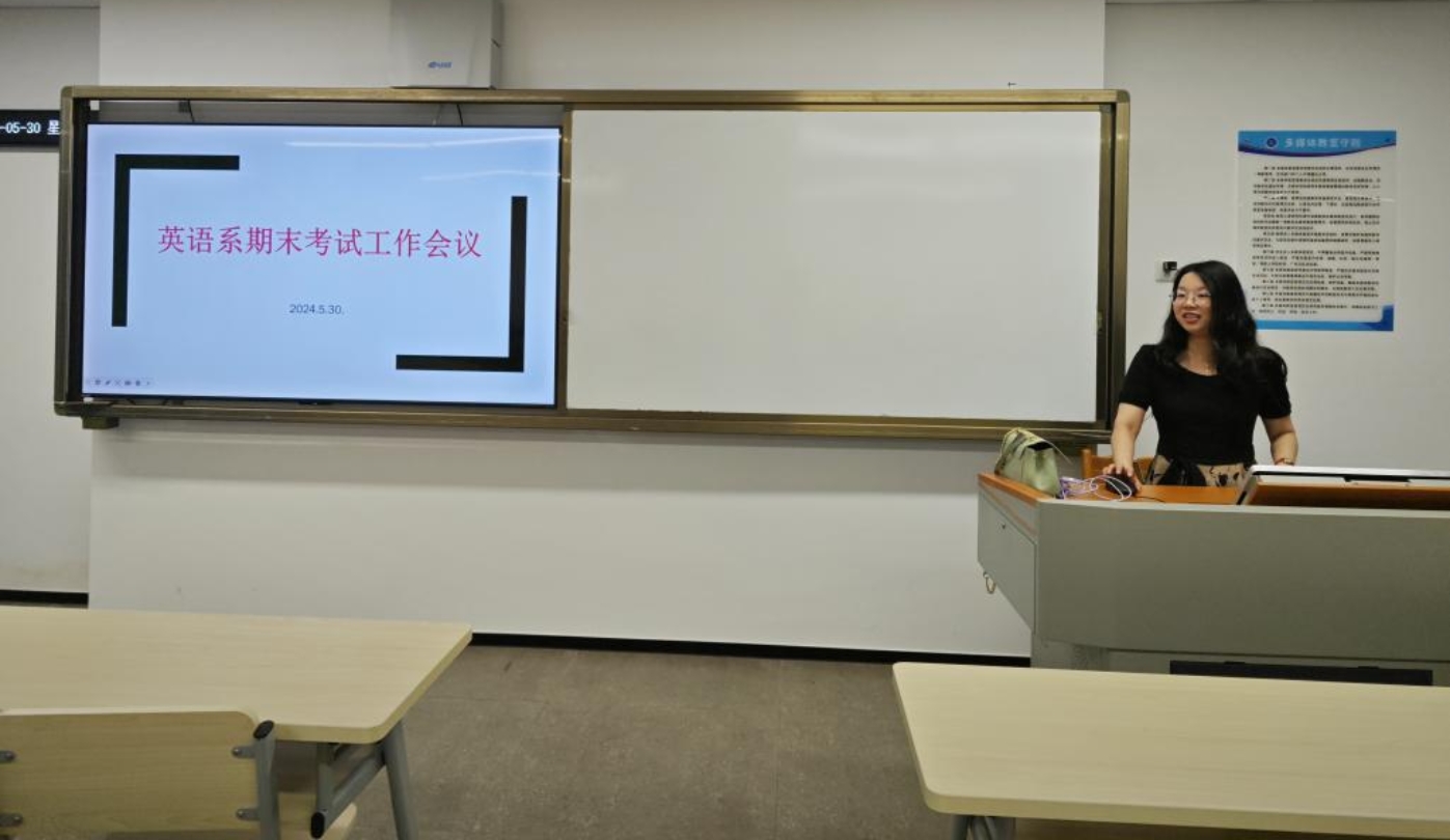 5月30日下午,英语系在第八教学楼205教室召开期末工作会议,系主任程瑜瑜老师主持,英语系全体教师参加。会议围绕学位论文抽检情况、督导查卷反馈、期末考核工作等方面展开。