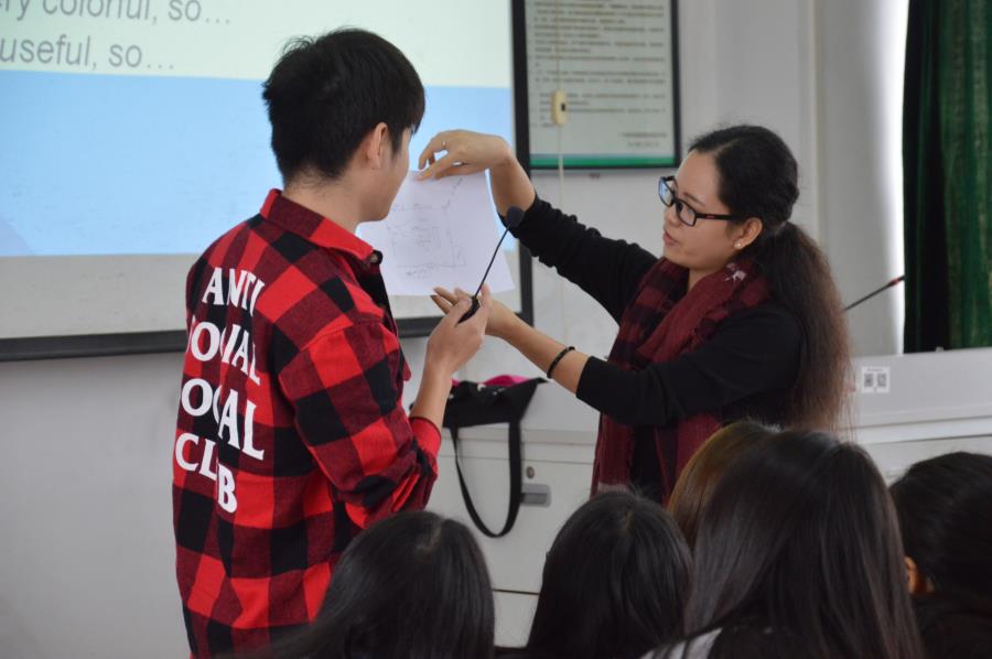 课堂上,李丽枚积极活跃课堂气氛,调动学生上课情绪。她运用任务型教学法,利用技术支持的现代教学手段,吸引同学们以小组合作探索的形式自觉参与到课堂讨论中来。小组任务有趣又贴近主题,师生展开互动,整个过程兼具知识性、趣味性与参与性。李丽枚在授课过程中与学生全英文交流,充分锻炼了学生商务英语听说能力。课程最后,学生对这节课的学习效果进行了即时反馈,这既能让学生梳理课堂掌握的知识,也给老师提出了更明确的改进方向。