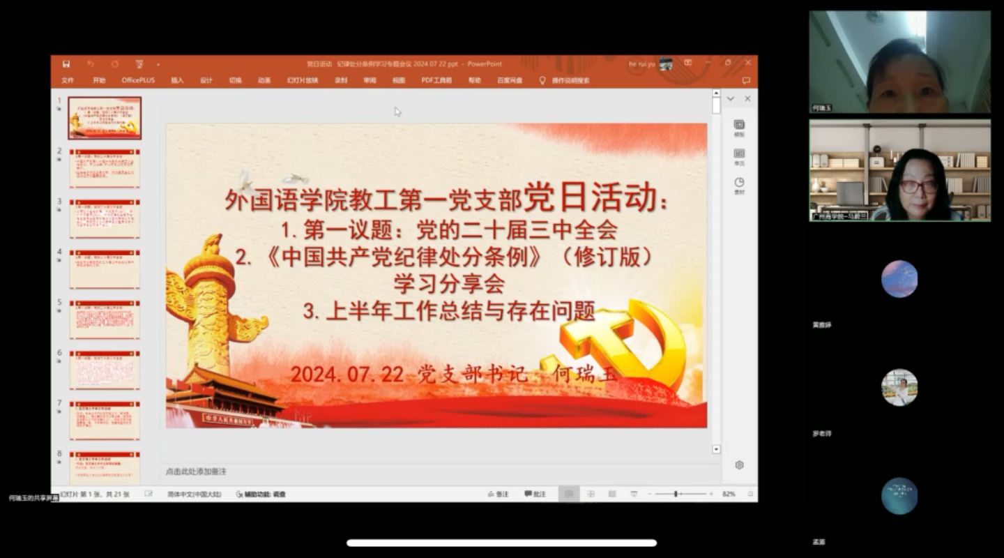 为进一步推动党纪学习教育走深走实,提高党员的纪律意识和规矩意识,精品人妻无码教工第一党支部于7月22日晚,在线上开展了新修订的《中国共产党纪律处分条例》(以下简称《条例》)学习分享的主题党日活动。党支部书记何瑞玉主持会议。