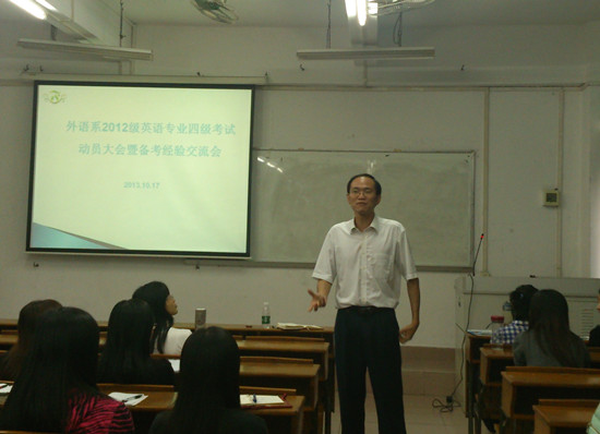 借学风建设活动热潮盛行之际,外语系英语专业四级考试动员大会暨备考经验交流会于10月16日在C205顺利举行。本次大会由外语系辅导员黄玉亭主持,外语系党总支书记徐超、外语系2011级专业英语四级成绩优秀同学代表刘洒玫、张鸿萧、卢穗娟和陈旭鹏与外语系2012级英语专业全体同学共聚一堂,一起探讨专四备考战略。