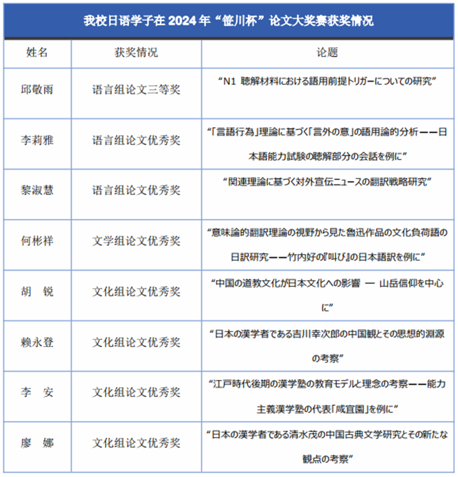 “笹川杯”日本研究论文大奖是由教育部高等教育外国语教学指导委员会,协同日本公益财团法人日本科学协会、日本中日友好基金会联合主办的国家级,具有国际影响力的学术盛事。“笹川杯”论文大奖被誉为“表现本科生学术水平”的国内最高级别的大奖赛,一直备受各个高校的瞩目。2024年“笹川杯”日本研究论文大奖共收到52所高校推荐的201篇参赛论文,其中语言组50篇、文学组50篇、文化组101篇,参赛论文涵盖了语言、文学、文化、历史、翻译等多个方向。我院有8篇参赛作品在论文中脱颖而出,勇夺大奖。这些论文以各自独特的视角、有力的论证、深入的研究、大量的调查数据和案例分析,提出了一系列具有创新性的观点,获得了评委们的高度评价。
