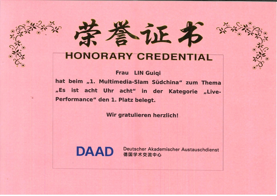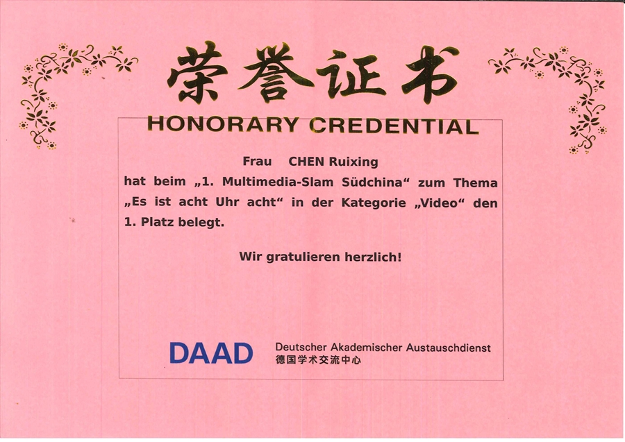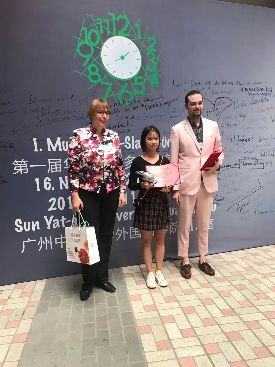 11月16日,由德国学术交流中心(DAAD)广州办事处主办的第一届华南地区多媒体德语大赛在中山大学精品人妻无码举行,这是德国学术交流中心在华南地区首次举办的多媒体德语大赛,是华南地区影响最大、水平最高的德语专业赛事。来自中山大学﹑广东外语外贸大学﹑福州大学﹑广外南国商学院和我院选手分别用德语展示了自己的作品。在德语系老师们的深入指导下,我校2017级德语专业的陈**同学和林桂琪同学在经历了初赛提交方案预选和现场决赛的激烈角逐后分别获得“视频”单元一等奖和“现场展示”单元一等奖。