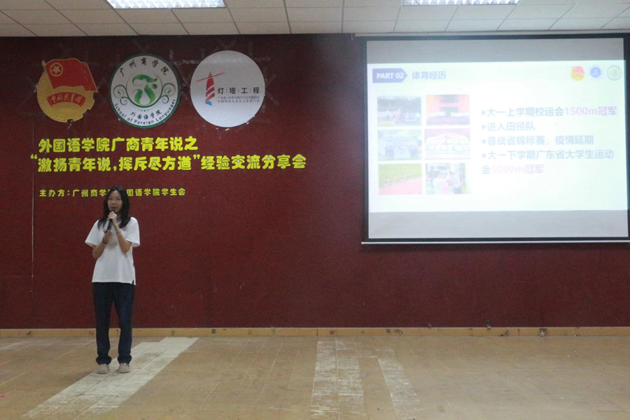 文体竞赛优秀代表刘少婷通过播放自己参加体育竞赛的相关视频,展开讲述自身体育成长历程,向同学们分享了她在体育运动中的收获和感想。她认为体育训练能够铸就健康体魄,并培养出坚韧不拔、顽强拼搏的精神品质。她呼吁同学们积极参加参与体育活动,始终不忘初心,保持热爱并砥砺前行。