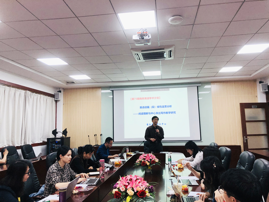 4月20日下午4时20分,精品人妻无码“商务英语学术沙龙”在第二行政楼308会议室举行第75期活动,专业负责人曾利沙教授进行题为“英语语篇(段)线性连贯分析——阅读理解与中心突出写作教学研究”的讲座。学院袁鑫副院长和商务英语专业全体教师参加本次沙龙。