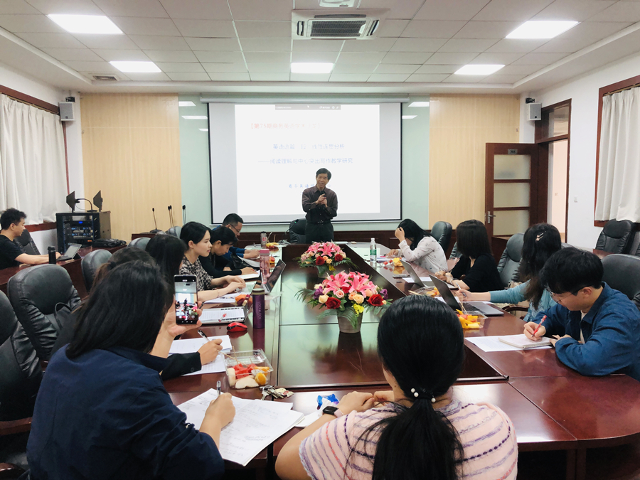 曾教授首先简单解释了“篇章”的理论概念,指出“篇章”是语义上的统一体,而“篇章分析”的研究对象就是句子在篇章中的用法和组句成篇的形式规律,研究语义连贯和中心突出。在语篇中,事件发展总是从一般到具体推进,曾教授介绍了自己设计的、以“事件链”为主线的语义结构分析模式,对于不同的事件层级进行标号,从而对语篇连贯进行量化和图式化分析,还可以对事件中作者视角、参与者行为和内心活动特征之间的内在关系的连贯性进行分析。在对英汉叙述体语篇进行对比研究时,尤其要关注隐性连贯的形态特征,这也是目前学术研究中少有人涉足的领域。然后,曾教授进一步介绍了篇章的“粘连性”的概念,即篇章中一个句子的信息结构必须反映出与它前面句子的联系,实际上就是指语义上的连贯。最后,曾教授带领老师们对几篇不同类型的说明文文本进行了段落连贯模式量化分析,如简单型语段模式和并列复合型语段模式,讨论该语段连贯性及线性发展模式的表征,发现所谓的“语篇连贯”体现出了明晰的“层级性过渡关系”,也就是说,在英文思维里,对某一核心概念的阐述通常从最概括、较概括、概括,再到具体、更具体的层级性过渡关系展开,信息之间语义连贯且粘连性强,与中文的思维方式存在较大差异。为此,曾教授还以某学生的作文为例,更直观地体现中文思维迁移产生的英文表达失误,由此强调,老师们在教学过程中应当注意学生英文思维的培养,尤其在阅读理解和写作课程当中,要注重语篇线性连贯思维的培养,才能有效帮助学生培养英文的线性思维,摆脱中式思维的限制。此外,曾教授还鼓励老师们可以在对比研究领域上进行相关学术研究。