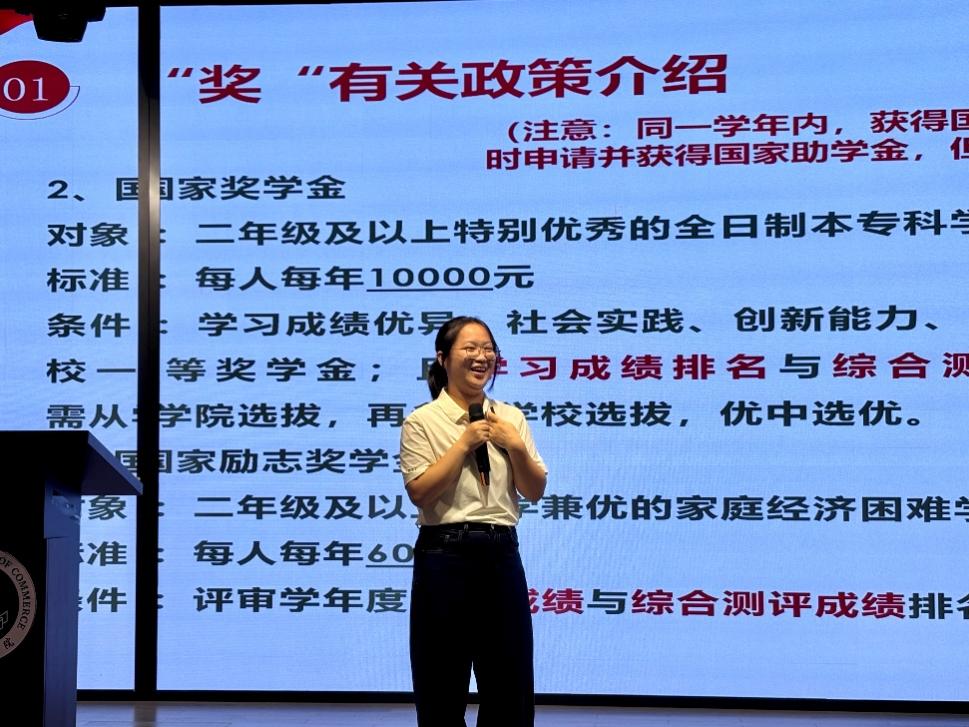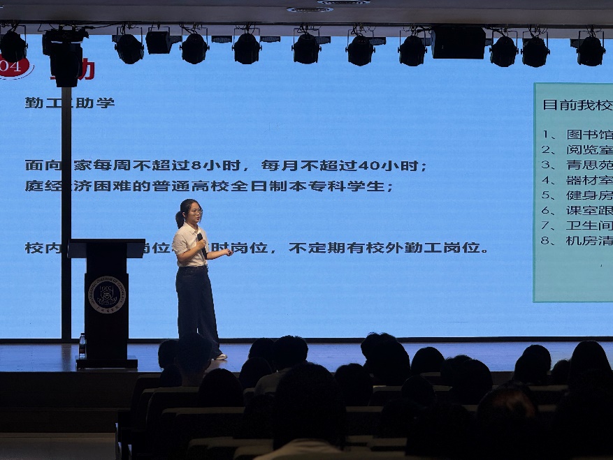 随后,谢敏丽重点讲解学生资助政策。奖学金方面,学校设有不同级别、不同申请条件的奖学金类型,特定年级学生可凭上一学年成绩参评。助学金需先完成困难认定,学生按要求提交申请及相关材料,经审核上报后确定资助档次,新生还可申请学校专项资助。此外,谢敏丽还介绍了生源地助学贷款、校内外勤工助学岗位及临时困难补助等资助形式。
