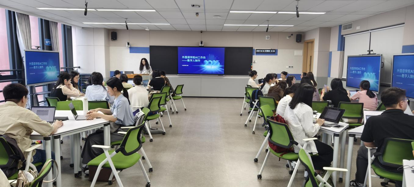 第二场工作坊由周婷老师主讲,主题为“数字人制作”。周婷现场展示了如何利用指令生成教学中需要的虚拟场景,并根据课程特色进行场景的变化。数字人对指令进行语言输出,并生成视频,这样可以极大的帮助老师进行知识点的输出,同时学生也可以在课后进行知识点的复习与巩固。周婷提出,数字人不仅能突破时空限制构建沉浸式语言环境,未来还可通过多模态数据采集实现学习效果精准评估,为个性化教学提供新解法。