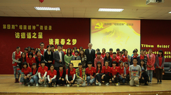 11月24日晚,由学院党委主办,外语系承办,中国特色社会主义学习会外语系分会及德语协会共同协办的第四期增院精神访谈之“访德语之星,谈青春之梦”在教学楼A206举行。学院党委副书记张秋艳、外语系党总支书记徐超、学院学习会指导老师宁金玲、德法教研室主任周昳旸以及童城、钟秀慧、周婷等老师出席了本次活动。