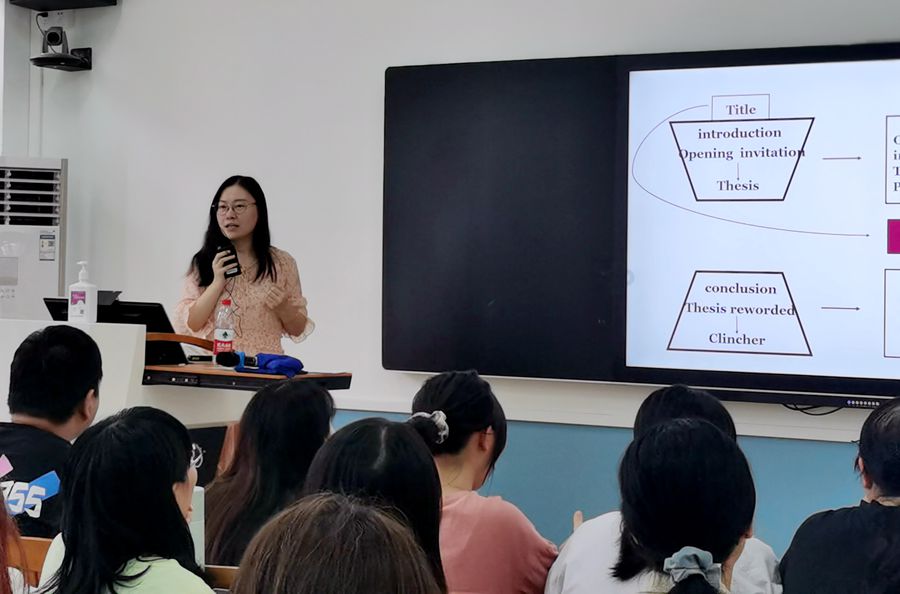 本次研讨课主讲为张慧慧老师,教学内容为How to Write an Effective Introduction。张老师先对上一单元的学习内容进行了简单的回顾和总结,接着在屏幕上显示一篇学生的作业进行分析,讨论“Functions of Introduction”,总结出两种Introduction的写作方法,并通过案例文本方式向学生介绍常规的写作步骤。然后,提出一个最新的热点社会问题,开展小组讨论,并写作一个Introduction,随后利用超星平台,对学生的练习进行即时点评和讲解,加深同学们对写作方法的理解。张老师全程用英语进行授课,教学设计完整,教学环节紧凑,师生互动较多,课堂气氛活跃。