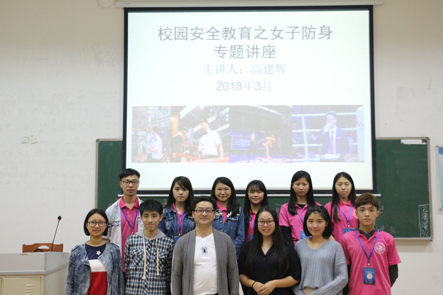 首先高建辉老师以互动的方式,深入浅出地向大家讲解了学习女子防身术的必要性,并且为我们强调了女子防身的基本原则与宗旨,要时刻牢记"以生命为首"的准则。紧接着,高老师从专业知识和紧急防护的角度详细地介绍了讲座的核心内容,围绕着女生容易进攻的六个部位——“眼睛、后脑、咽喉、浮肋、裆部、小指”,给我们讲解人体要害部位被击打后的生理反应以及有效的攻击方法,从击打方法、体位、力度到工具,结合着精准的动作示范和模拟演习,帮助同学们正确了解到如何面对突发状况,并深入地领悟了防身术的精髓。最后,高老师还为我们介绍了各种女子防身器材。掌握好基本的防身技能是必要的,如果能有一个防身器在身,还可以更大限度地保护好自己。同时,他认为不同年龄人群的作恶心理各有不同,有时在危难时刻想要全身而退,也需要结合实际情况采用智取的策略。讲座中,高建辉老师课堂语言风趣幽默,模拟情景逼真得当,同学们听得津津有味,掌声连连不断。