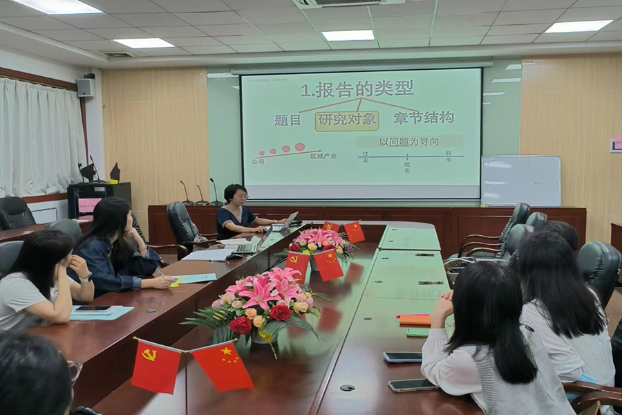 在本次报告会前,商务英语系经过了广泛调研,梳理了上一年度在商务英语实践报告指导中所面临的问题。会上,陈雪珍从商务实践报告的类型、逻辑、答辩要点三个角度出发对这些问题进行了回应。她首先简明扼要地概括了商英指导报告的常见类型:问题分析、成功案例分析等。接着,陈雪珍指出了学生报告中章间承接应注意的逻辑问题,并提出了应对方法。最后,陈雪珍阐发了答辩要点:答辩老师应对学生进行鼓励式指导,表扬论文亮点,同时注重引导并帮助学生发现不足。