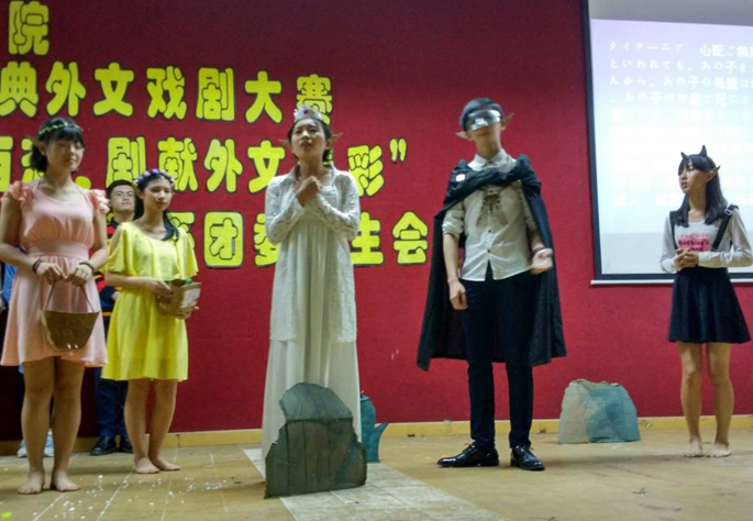 今年的外文戏剧大赛和以往不同,摒除了以往以童话故事为主要背景,外加百搭和穿越的风格,这次采取的是招聘导演和演员,以莎士比亚的经典著作为核心而进行的忠于原作的演出。决赛中,德语剧团和日语剧团以燃烧生命的态度,可爱的身姿,还有幽默的语言为现场观众展示了《仲夏夜之梦》的美丽爱情。英语剧团以华丽服饰,生动的表情展现了《驯悍记》中15世纪的欧洲贵族的典雅大方,赢得了满堂喝彩。最终结合当晚的表演成绩、赛前投票及大众评审团的肯定,日语剧团获得冠军。