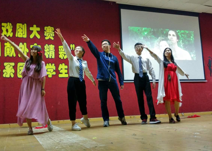 展世界经典文化魅力,秀外文学子魅力风采,外语系团委学生会于4月15号在教学楼A206举办了以“戏品社会百态,剧献外文精彩”为主题的第五届外文戏剧大赛。外语系党总支书记徐超、团委书记刘万里、副书记黄玉亭及各兄弟院系代表均受邀莅临现场观看。