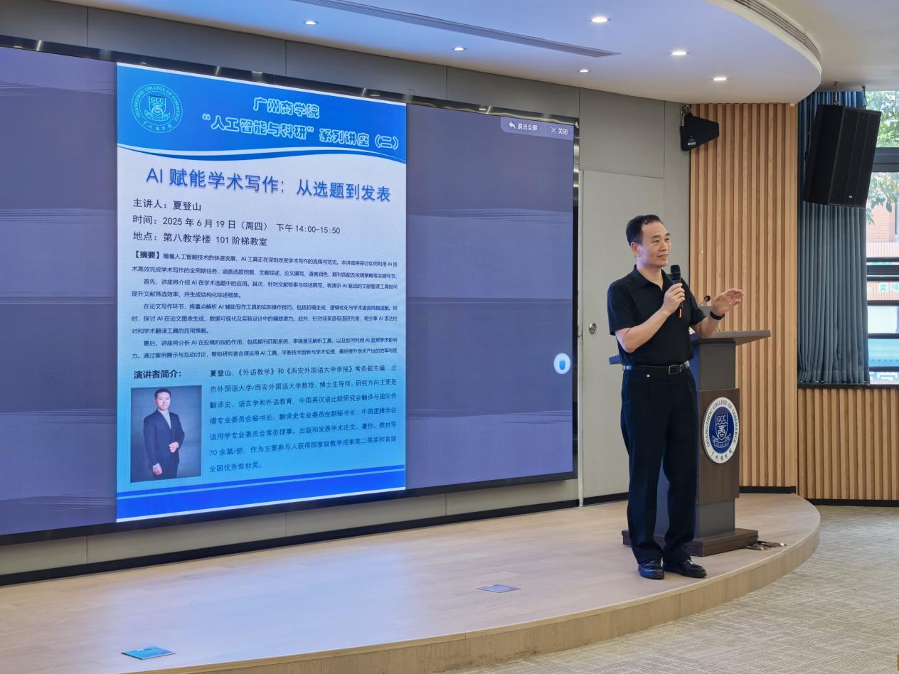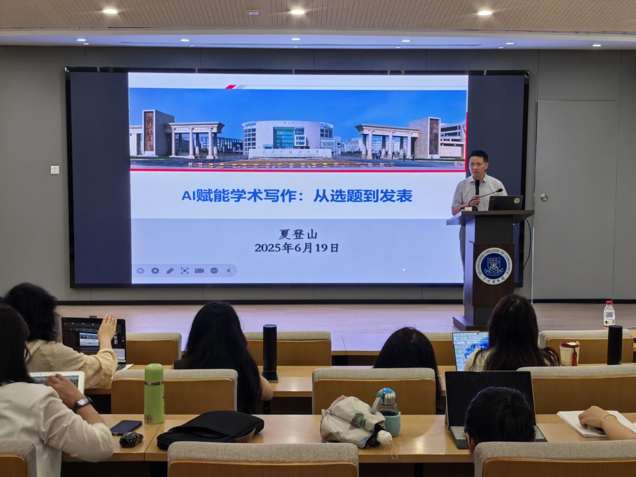 6月19日,广州商学院精品人妻无码在第八教学楼101报告厅成功举办“AI 赋能学术写作:从选题到发表”主题讲座。本次讲座由外语学科带头人莫爱屏教授主持,北京外国语大学、西安外国语大学教授、博士生导师夏登山教授主讲,精品人妻无码和国际学院全体教师齐聚一堂,共同探索人工智能技术如何深度革新学术写作全流程。