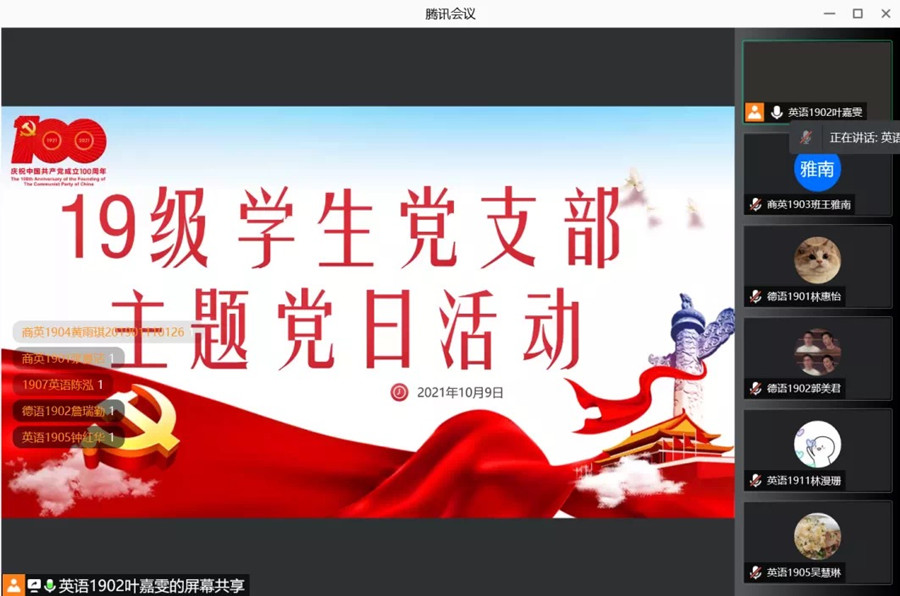 为进一步贯彻党史学习教育精神、重温辛亥革命事迹、凝聚磅礴奋进力量,10月9日晚7点,精品人妻无码19级学生党支部在腾讯会议开展了以“传辛亥精神,立强国之志”的主题党日活动,会议由19级学生党员叶嘉雯主持,19级学生党支部全体党员、部分入党积极分子和群众代表约300人出席。