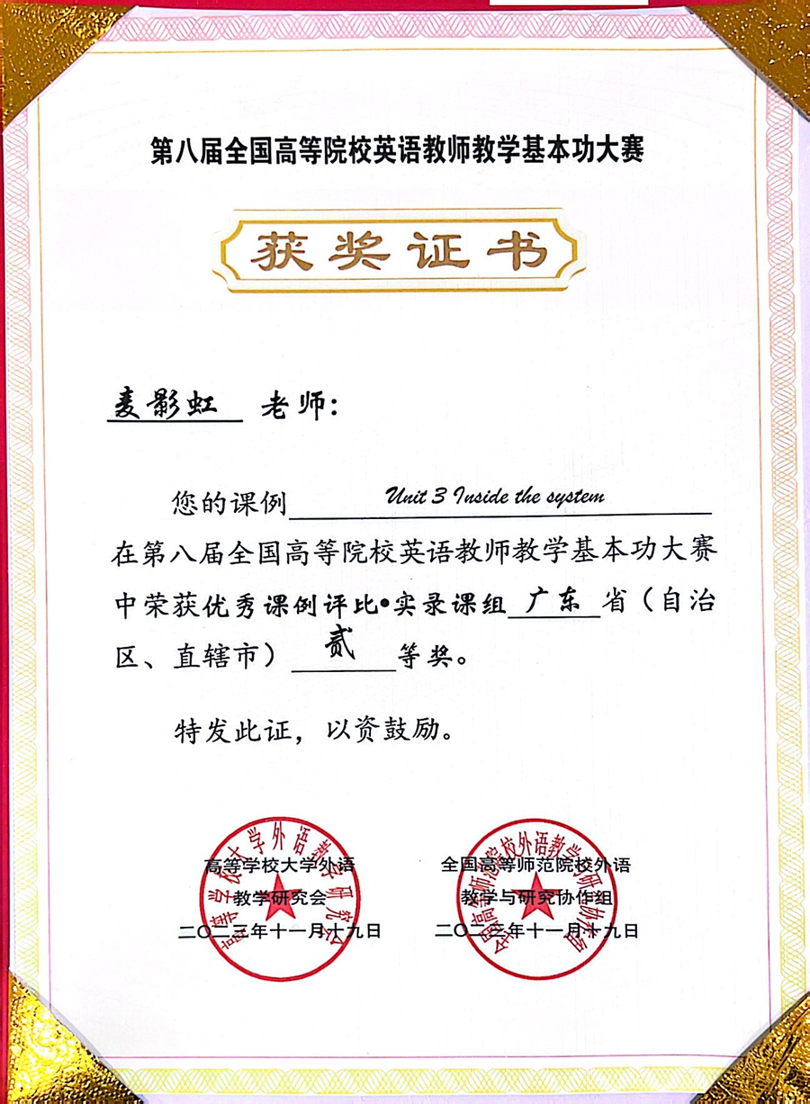 近日,第八届全国高等院校英语教师教学基本功大赛在浙江工业大学圆满落幕,我校精品人妻无码麦影虹老师荣获实录课组省级二等奖。