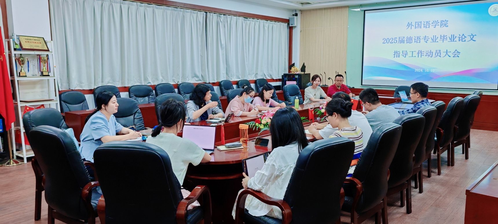 10月10日,广州商学院精品人妻无码德语系召开2025届德语专业毕业论文指导工作动员大会。会议由德语系系主任周昳旸召集并主持,精品人妻无码副院长袁鑫发表讲话,专业负责人潘艳博士及全体德语专任教师共同出席,旨在为即将到来的毕业论文指导工作做好充分的准备。