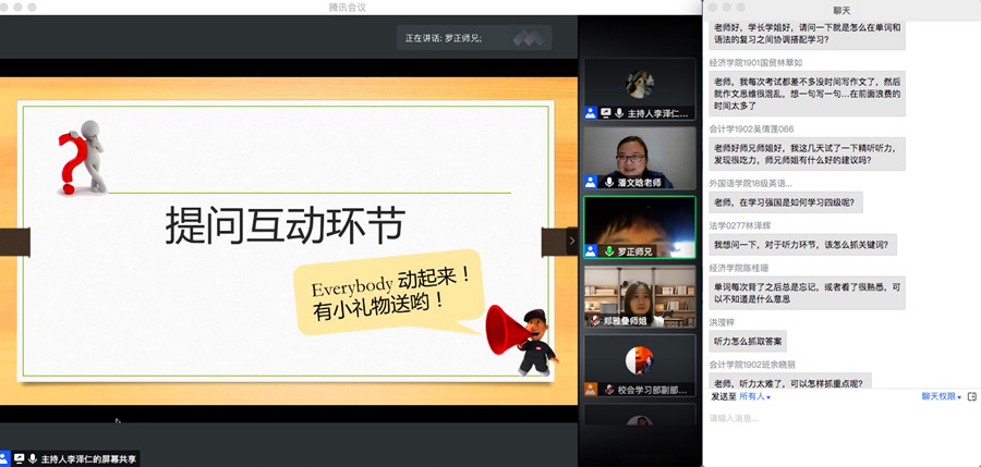 在疫情防控的背景下,潘文晗对大学英语四级考生的报考资格、防疫要求、题型与复习对策以及英语学习方法等方面进行了细致的讲解,令与会者受益匪浅。在大学英语四级考试的阅读和翻译的题型方面,罗正强调知识的积累与阅读习惯的培养非常重要,一定要认真研习历年的四级真题。在听力和写作方面,郑雅叠认为多模仿、多练习有助于提高语言基本功,而经常练习形成的语感则对考试起到重要作用。在观众互动环节,同学们通过“腾讯会议”与“速课堂”的提问区与老师和嘉宾进行互动,现场反响热烈。