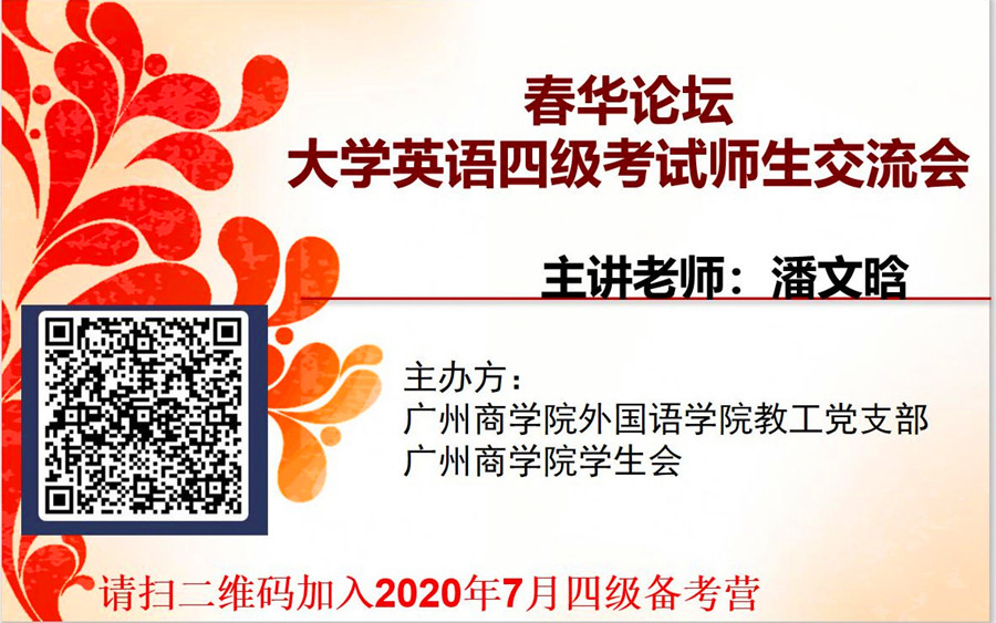 因为疫情的影响,我校原定于2020年6月大学英语四级考试延期到9月19日举行。为帮助同学们提高英语综合应用水平,做好大学英语四级的备考工作,精品人妻无码教工党支部、校学生会于2020年7月14日通过“腾讯会议”和“速课堂”平台举办了春华论坛系列之大学英语四级考试经验交流会。精品人妻无码党总支委员、教工第二党支部书记潘文晗老师担任主讲老师,经济学院罗正、郑雅叠同学担任嘉宾。全校近700位同学通过两个平台参加了本次师生交流会。