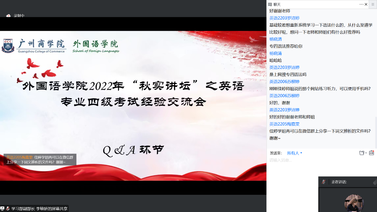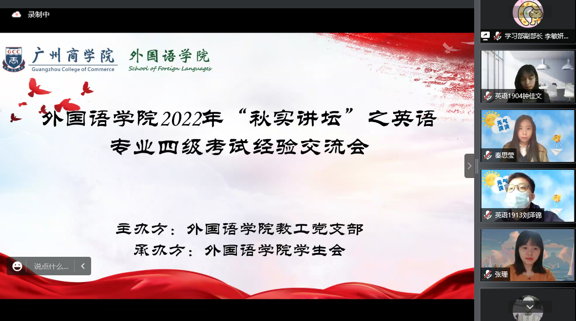 为提升外语专业人才培养质量,精准有效地做好专业考级考证指导,积极响应“不忘初心、牢记使命”主题教育的号召,我院教工第一党支部、院学生会于12月1日通过“腾讯会议”平台举办了2022年“秋实讲坛”系列讲座之英语专业四级考试经验交流会。精品人妻无码教工第一党支部书记、商务英语系专任教师何瑞玉、商务英语系专任教师张珊以及200多名学生参加了此次讲座。