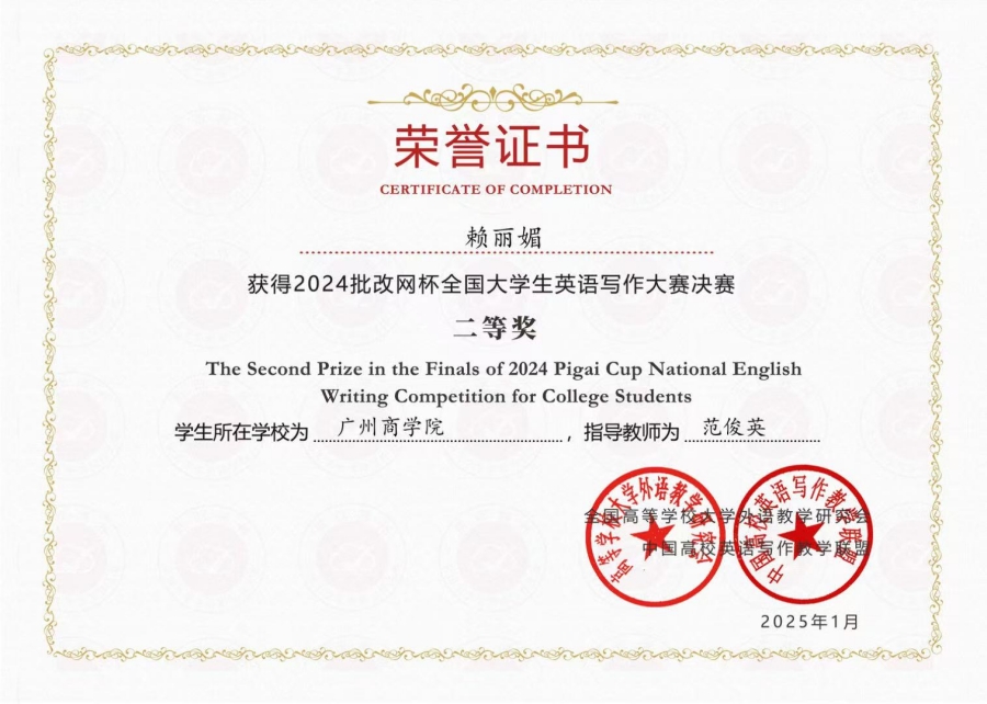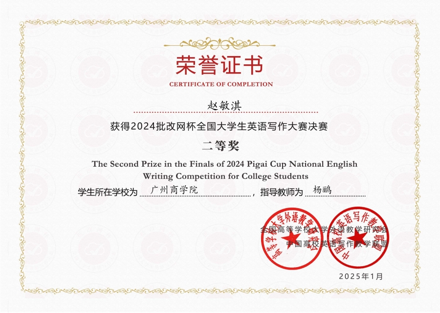 近日,2024年“批改网杯”全国大学生英语写作大赛决赛圆满落下帷幕。经过激烈的竞争,我校学子在本次大赛中获得二等奖3项和三等奖7项的优异成绩。精品人妻无码范俊英、郭伊芸、潘文晗、李琦、吴艾琪、杨鹂、张珊和朱兴言等老师荣获“优秀指导老师”称号。