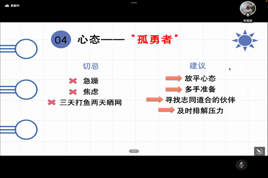 李雨柔从英语教师编制考试的基本情况,考试基本流程以及考试技巧与考试建议为各位同学进行讲座分享。李雨柔在介绍考试的基本情况的时候,她通过珠三角和粤西地区等地域的历年基本招考情况和条件进行了详细的分析。同时她指出,备考英语教师编制的时候,需要重视做题方式技巧,比如“三有策略”“先候再薄策略”等。她最后强调了在面试环节,试讲、说课和结构化的区别和提出了宝贵的备考经验。在答疑环节,李雨柔讲述了自己在工作中遇到问题和挑战和思考出解决方法,以及如何在教学领域实现自我的价值。最后,蔡文蝶对本次活动进行总结,她首先感谢李雨柔师姐的分享,其次她对参与的观众提出明确求职目标,树立求职目标和坚持求职目标三点建议。